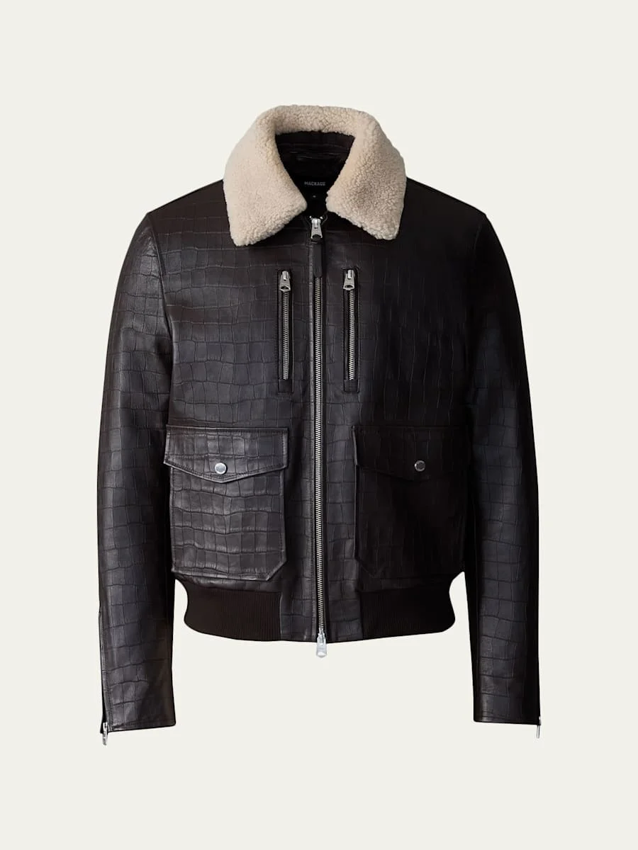 The "Chance-NV" by Mackage is a croc-embossed leather jacket with a removable dyed sheep shearling (Turkey) collar, engineered for elevated everyday wear. Two-way front zip closure Chest zip pockets Double-entry flap pockets Inner welt zip pocket Underarm eyelets for ventilation Zip sleeve vents with gusset Ribbed hem Fully lined with quilted insulation Regular fit Leather/polyester Dry clean Temperature Rating: 0°C Imported Online Inquiries: BGS21_NEPCN| Store Inquiries: #5436843