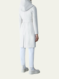 Mackage "Shia" two-in-one coat crafted from soft double-face wool Approx. 39"L from shoulder to hem Removable light recycled down bib with stand collar and zip closure Signature Mackage hood Asymmetrical front zip closure Long sleeves Self-tie leather sash belt Leather-trimmed welt waist pockets Vented back Knee-length Fitted silhouette Wool/nylon/polyamide/spandex Lining: Polyester/viscose Fill: Feather/Down Down to -5ºc Dry clean, leather method dry cleaning Imported Online Inquiries: BGS21_T6TKK| Store Inquiries: #4875951