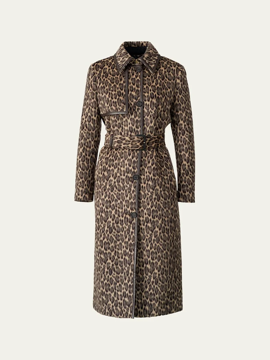 The "Zeva-A" trench coat by Mackage is crafted from a leopard-printed blend of alpaca wool and finished with luxe leather trim for a sophisticated look. Point collar Single-breasted front Long sleeves Adjustable self-belt Side pockets Classic fit Center back vent Button-front Wool/nylon/polyamide Lining: Polyester/viscose Dry clean, leather method dry cleaning Imported Online Inquiries: BGS21_T6XTH| Store Inquiries: #5063093