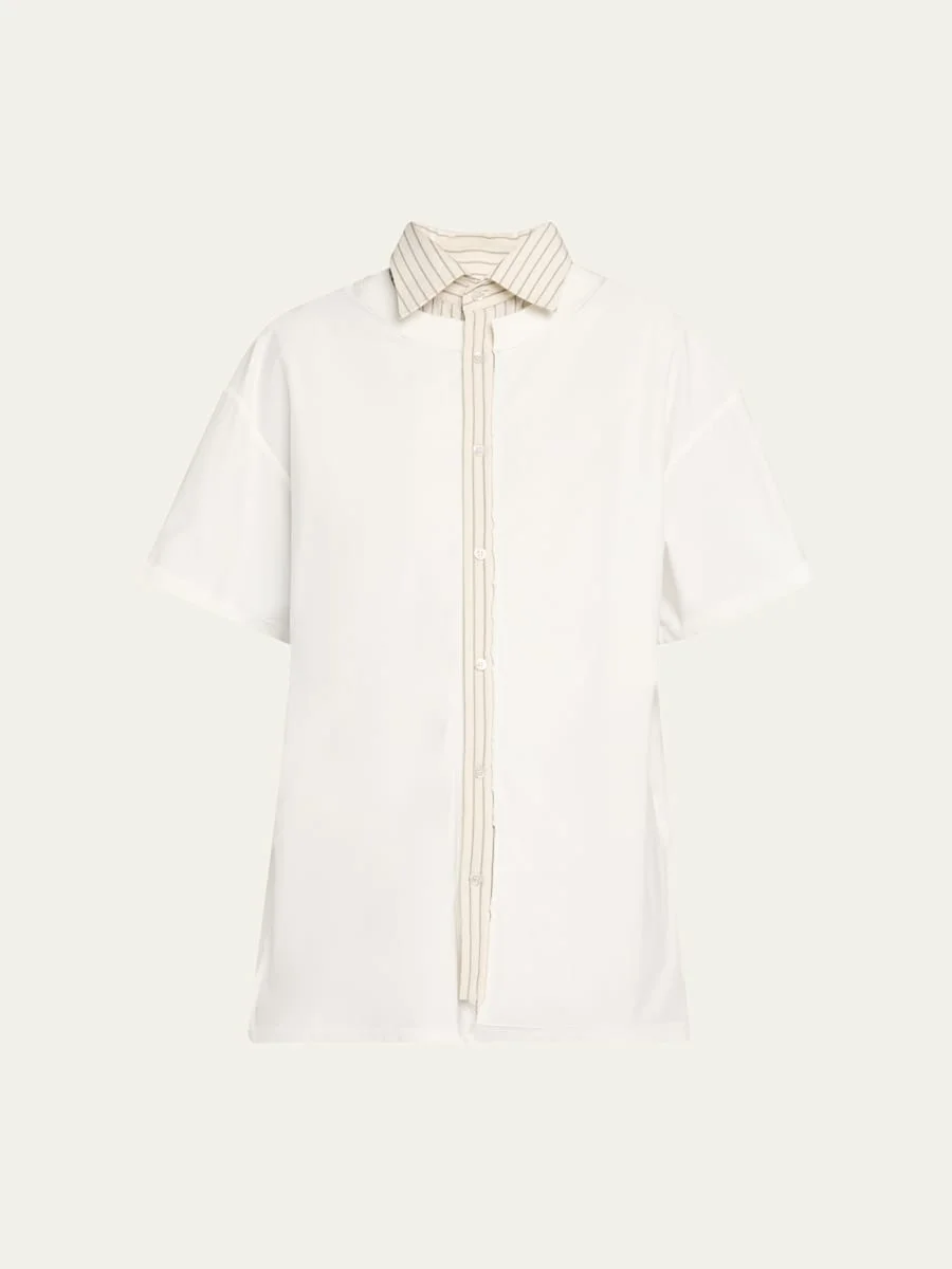 Maison Margiela heavy jersey T-shirt with classic striped shirting trim Point collar; button front Short sleeves Oversized fit Pullover style Cotton/cotton Dry clean Made in Italy Online Inquiries: BGS21_B9U9E| Store Inquiries: #4969373