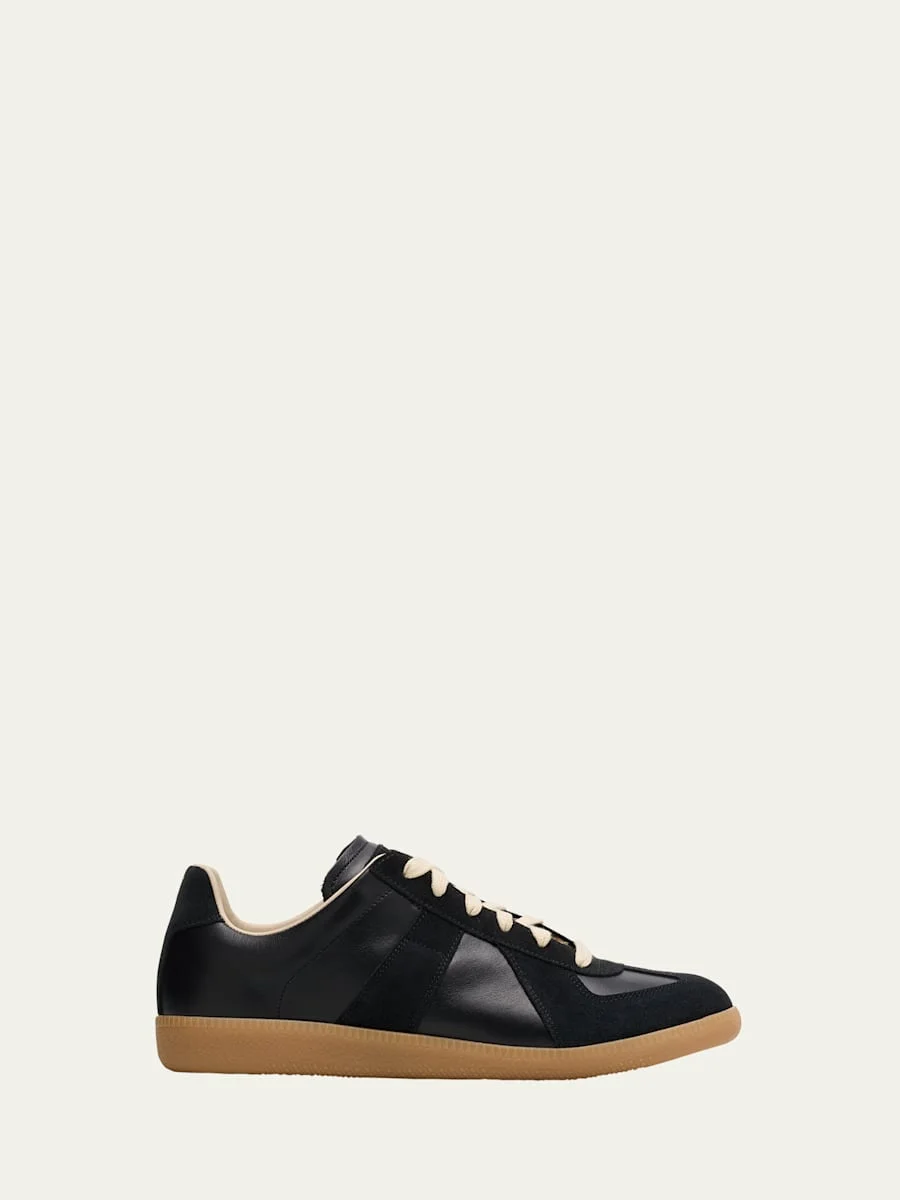Maison Margiela "Replica" lowtop sneaker in smooth leather with suede overlays Flat heel Round toe Laceup vamp Logo patch at tongue Signature stitch detail on heel counter Rubber outsole Made in Italy