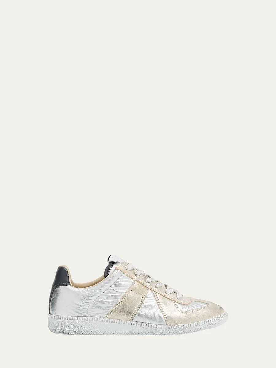 Maison Margiela's iconic lowtop inspired by Australian sports shoes from the 70s, the "Replica" sneakers are crafted from metallic suede, smooth leather and technical fabric 0.75 in / 20 mm flat heel Round toe Laceup vamp Signature label at tongue Padded collar Rubber outsole Lining: Leather/cotton Spot clean, wipe clean Made in Italy