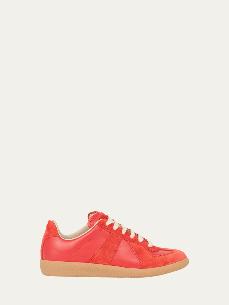 Maison Margiela "Replica" lowtop sneakers in twotone calfskin leather and suede. Flat heel. Round toe. Laceup vamp. Leather lining. Rubber sole. Made in Italy.