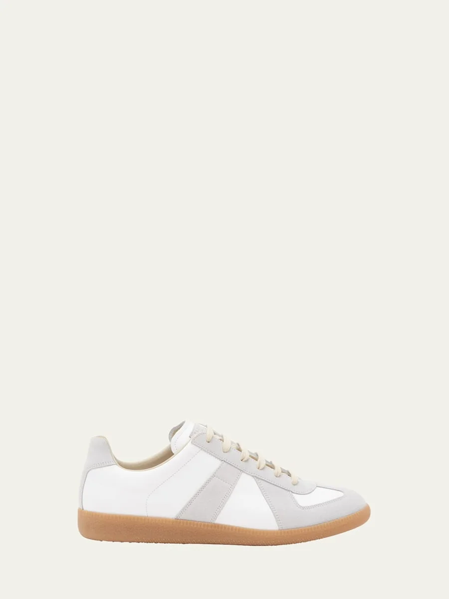 Maison Margiela "Replica" lowtop sneakers in twotone calfskin leather and suede. Flat heel. Round toe. Laceup vamp. Leather lining. Rubber sole. Made in Italy.