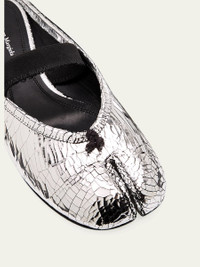 Maison Magiela "Tabi" ballerina mules crafted from calf leather with a broken mirror effect finish and signature split toe detail Flat heel Round toe Distressed elastic Mary Jane strap Easy slide style Leather lining and outsole Spot clean, wipe clean Made in Italy Online Inquiries: BGS21_X7BWK| Store Inquiries: #5369512