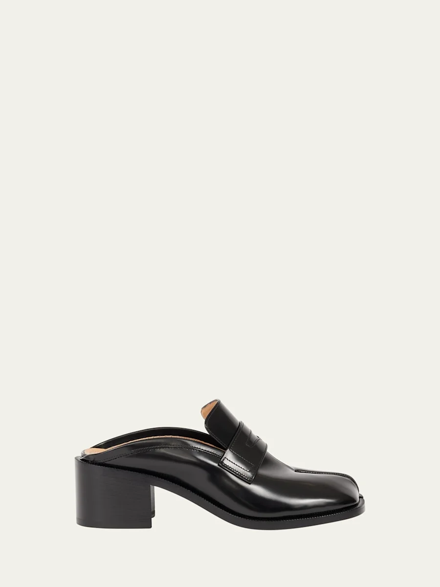 Maison Margiela "Tabi" loafer mules in shiny calfskin leather 2.25 in / 55 mm block heel; 0.25 in / 10 mm platform Round split toe Notched vamp with keeper strap Easy slide style Leather/Rubber outsole Lining: Leather Spot clean, wipe clean Made in Italy Online Inquiries: BGS21_X6XHZ| Store Inquiries: #5039167