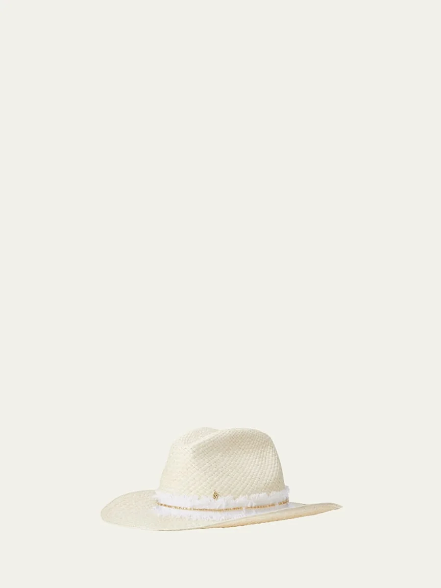 Maison Michel "Austin " cowboy hat in 3 strands of brisa straw braided by hand and vegan leather Features a signature metal logo Pinched crown Curved brim Embellished with a denim and strass ribbon band Item Weight (Lbs.): 0.4 Made in Spain Online Inquiries: BGS21_D53YY| Store Inquiries: #4949374