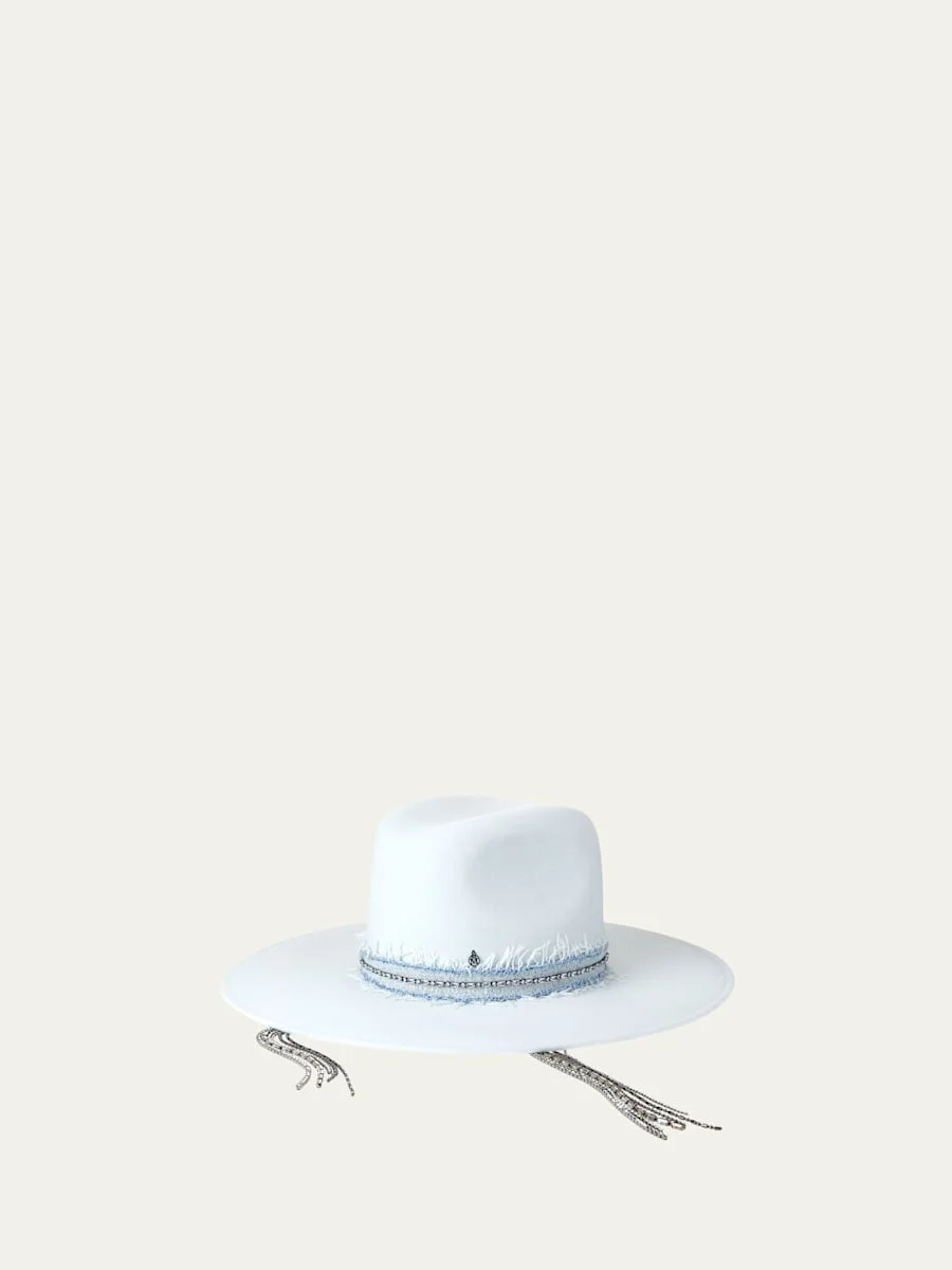 Maison Michel "Eliza" felt fedora in wool and cotton Center dent crown Bleached denim band; logo charm Embellished accent on the break Flat, wide brim Item Weight (Lbs.): 0.5 Made in Italy Online Inquiries: BGS21_D4XZH| Store Inquiries: #4807077