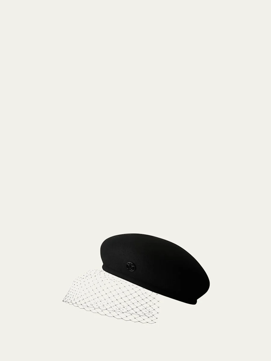 Maison Michel New bonnie veil felt wool Beret in black wool felt. Embellished by a black veil and a metal maison michel logo on the side. Item Weight (Lbs.): 0.4 Wool/nylon/polyamide Spot clean, wipe clean Made in Germany Online Inquiries: BGS21_D4XZU| Store Inquiries: #4807292