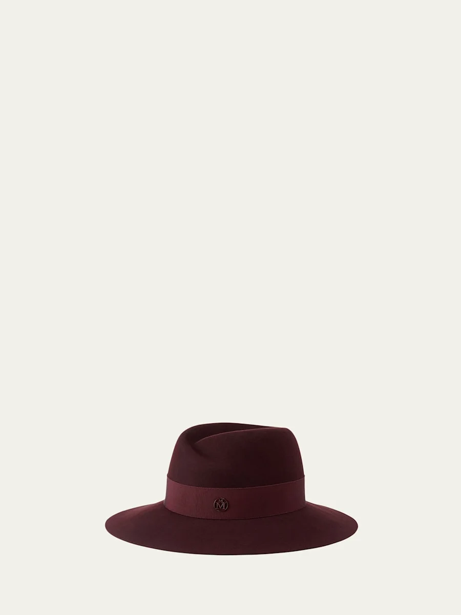 Maison Michel "Virginie" timeless fedora crafted from waterproof wool felt Embellished by a tonal grosgrain ribbon and a metal logo on the side Concave crown Flat brim Item Weight (Lbs.): 0.4 Wool/cotton/viscose Spot clean Made in France Online Inquiries: BGS21_D5ATK| Store Inquiries: #5049229