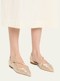 Defined by its sculptural cutaway and slender diagonal strap, the "Bettina" ballerina flats by Malone Souliers offer effortless elegance. This version is crafted in lustrous satin with a crystalembellished floral design. 0.25 in / 10 mm flat heel Pointed toe Asymmetric Mary Jane buckle strap Upper: Silkette® viscose Leather outsole Wipe clean Made in Italy