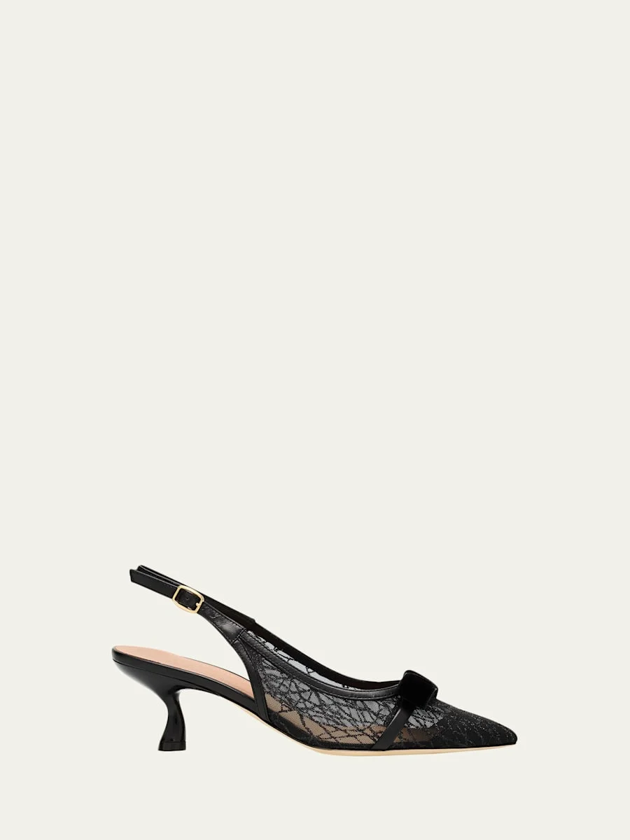 Rendered in glittering mesh, the "Jama" slingback pumps by Malone Souliers are trimmed with smooth leather and a velvet bow, creating a shoe that is delicate by design yet bold in detail. 1.75 in / 45 mm curved kitten heel Pointed toe Adjustable slingback strap Polyester upper Leather sole and lining Made in Italy