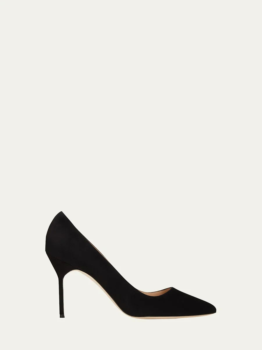 Manolo Blahnik "BB" suede pumps 3.50 in / 90 mm stiletto heel Pointed toe Slipon style Leather outsole Made in Italy