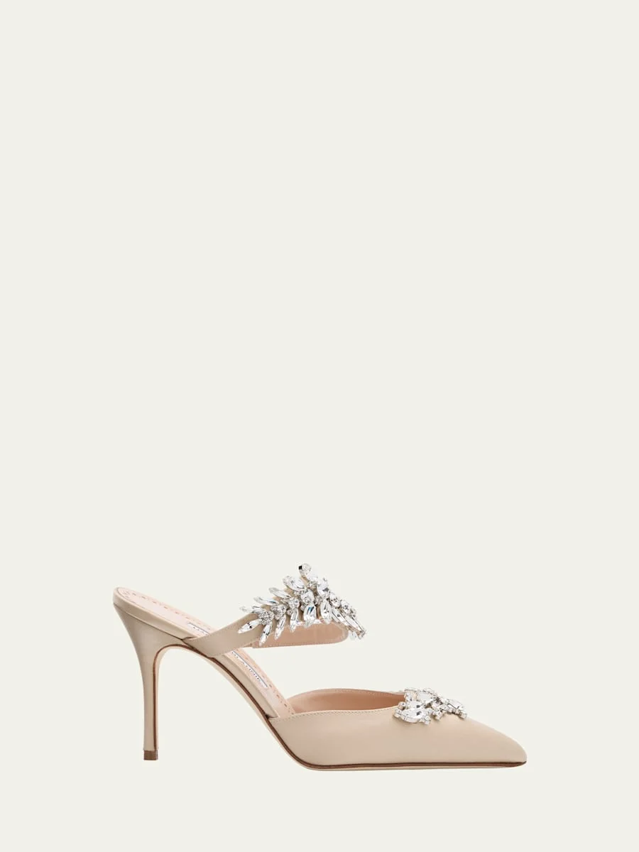 Manolo Blahnik's "Lurum" pumps are crafted from lustrous satin and embellished with mixedcut crystals 3.50 in / 90 mm stiletto heel Pointed toe Elasticized midvamp band Slide style Leather lining and outsole Made in Italy