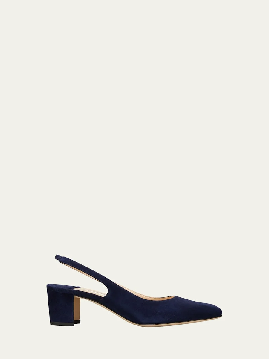 Manolo Blahnik 50mm "Allurasan" suede pumps. 2" covered block heel. Almond toe. Adjustable slingback strap. Leather lining and sole. Imported.