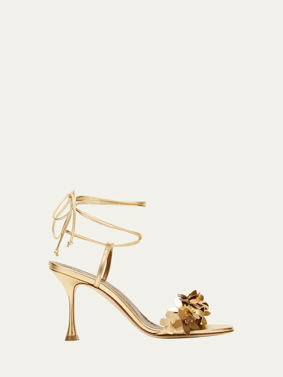 Manolo Blahnik "Anista" metallic leather sandals with floral appliques 3.50 in / 90 mm stiletto heel Open toe Adjustable self-tie ankle strap Leather outsole Lining: Goat leather Made in Italy Online Inquiries: BGS21_X6WM2| Store Inquiries: #5025803
