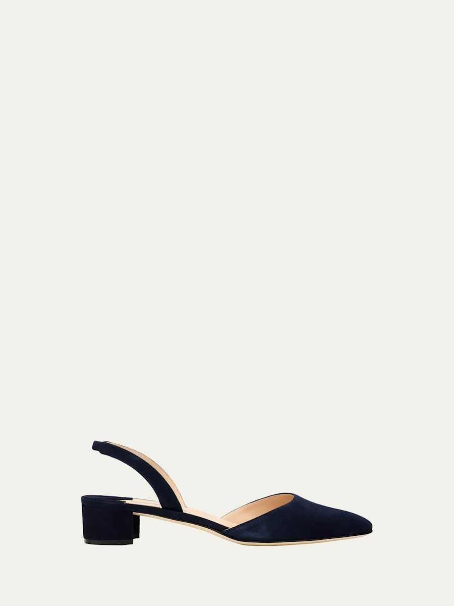 Manolo Blahnik "Aspro" suede ballerina pumps 1.25 in / 30 mm block heel Almond toe Stretch slingback strap Leather outsole Made in Italy