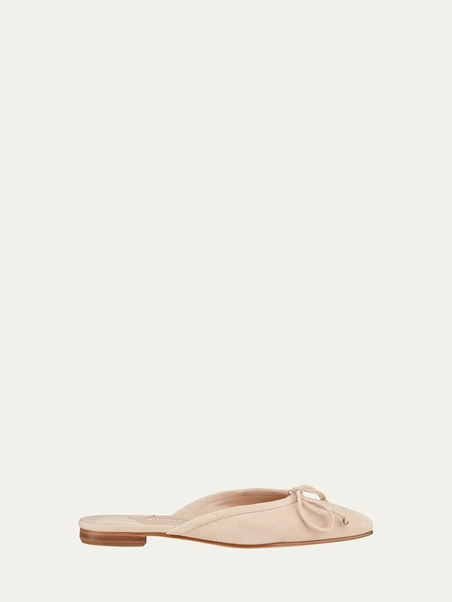 Manolo Blahnik kid suede ballerina mules. Flat heel. Pointed toe. Bow ties at vamp. Leather lining and sole. Slide style. Made in Italy. Online Inquiries: BGS21_X5DDX| Store Inquiries: #4077756