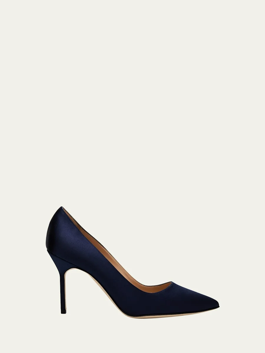 Manolo Blahnik "BB" satin pumps 3.50 in / 90 mm stiletto heel Pointed toe Slipon style Leather outsole Made in Italy