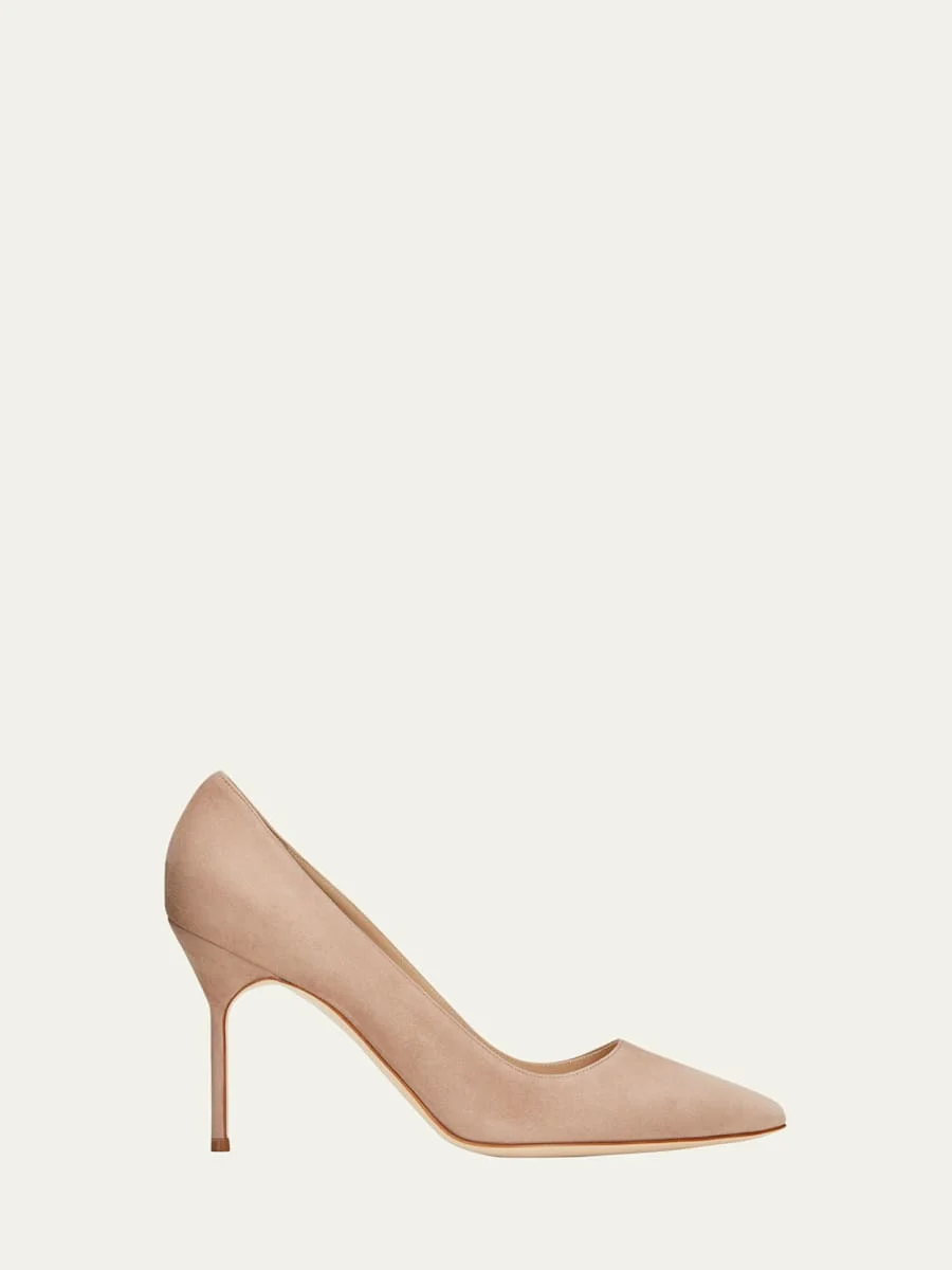Manolo Blahnik "BB" suede pumps 3.50 in / 90 mm stiletto heel Pointed toe Slipon style Leather outsole Made in Italy