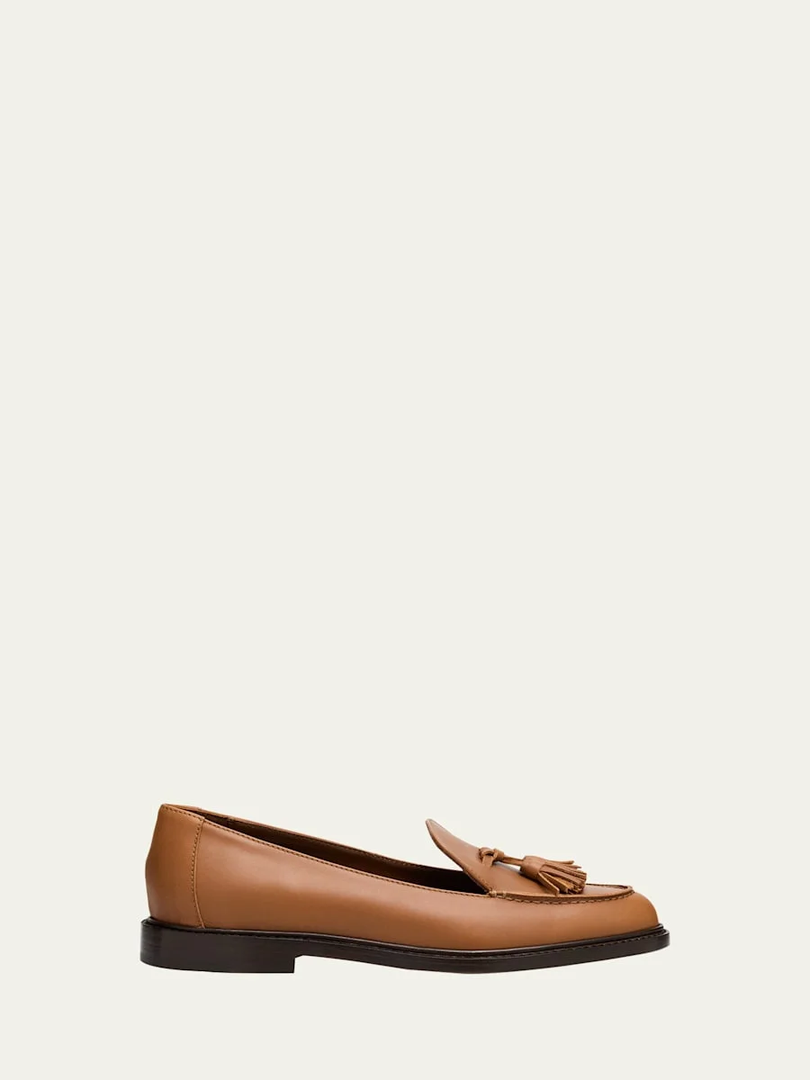 Manolo Blahnik "Bucky" calfskin leather loafers 0.25 in / 10 mm flat heel Almond moc toe Notched vamp with tassels Slip-on style Leather outsole Lining: Goat leather Made in Italy Online Inquiries: BGS21_X6WM1| Store Inquiries: #5025802