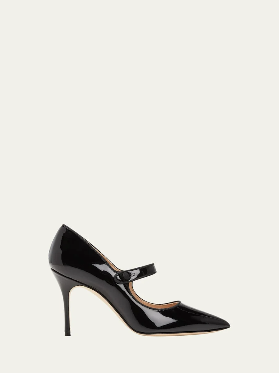 Manolo Blahnik "Campari" patent leather pumps 3.50 in / 90 mm stiletto heel Pointed toe Mary Jane button strap Leather outsole Made in Italy