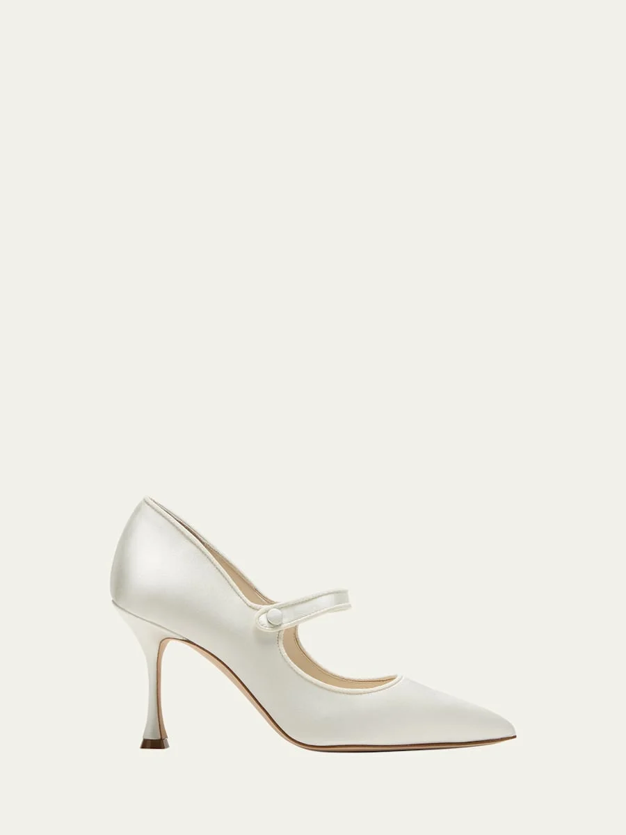 Manolo Blahnik "Camparinew" satin pumps 3.50 in / 90 mm stiletto heel Pointed toe Mary Jane button strap Leather outsole Lining: Leather Made in Italy