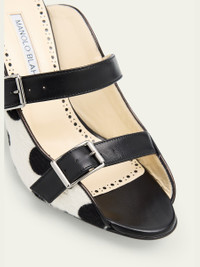 Manolo Blahnik "Capbal" sandals add a playful twist, crafted from polka dot–dyed calf hair (Italy) and blended with smooth leather to create a bold statement shoe 3.50 in / 90 mm stiletto heel Open toe Dual buckle vamp straps Slide style Leather outsole Lining: Goat leather Made in Italy Online Inquiries: BGS21_X6WLZ| Store Inquiries: #5025800