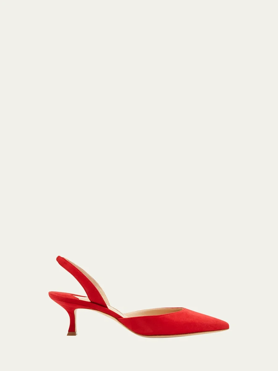Manolo Blahnik "Carolyne" kid suede pumps 2.00 in / 50 mm kitten heel Pointed toe Stretch halter slingback Leather outsole Lining: Leather Made in Italy