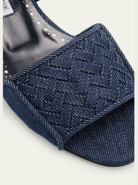 Manolo Blahnik "Vibius Den" sandals in cottton chambray with woven vamp detailing 1.25 in / 30 mm covered block heel Open toe Wide band vamp Buckle ankle strap Goat leather lining Leather outsole Made in Italy Online Inquiries: BGS21_X6WEH| Store Inquiries: #5022553