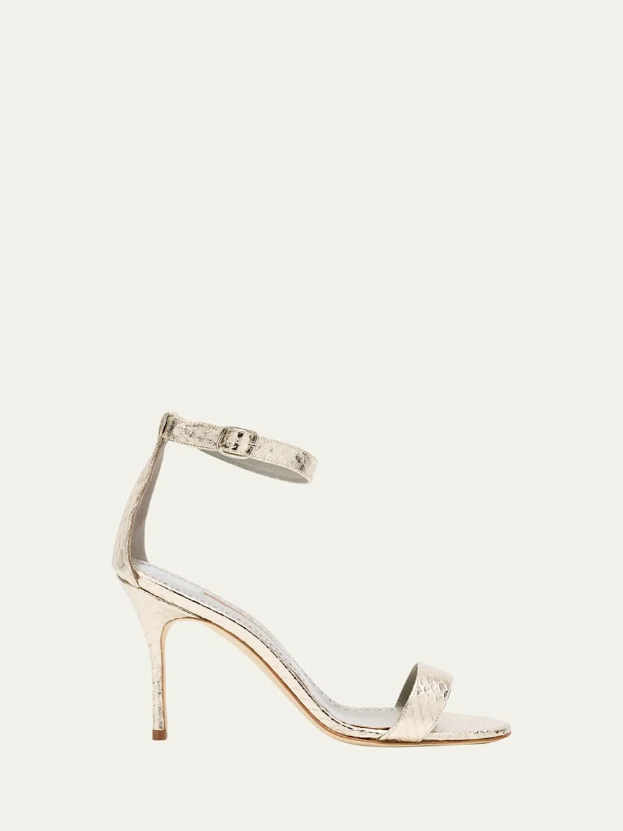 Manolo Blahnik "Chaos" pumps in metallic snakeskin 3.50 in / 90 mm stiletto heel Round open toe Single band vamp Buckle ankle strap Goat leather lining Leather outsole Made in Italy This item cannot be sold or shipped to California. Online Inquiries: BGS21_X6ZDR| Store Inquiries: #5070349
