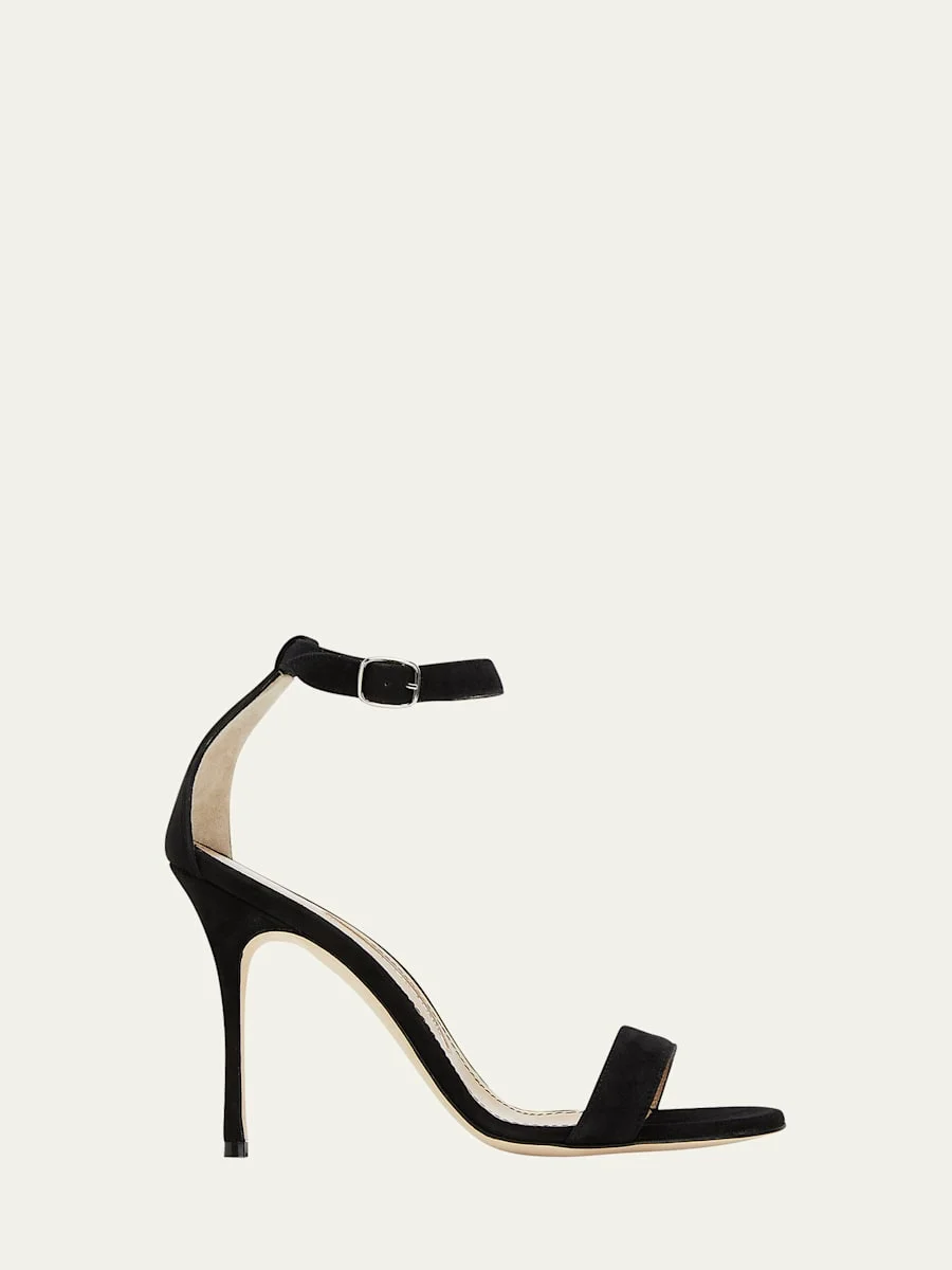 Manolo Blahnik "Chaos" kid suede sandals 4.25 in / 105 mm stiletto heel Open toe Adjustable ankle strap Leather outsole Lining: Leather Made in Italy