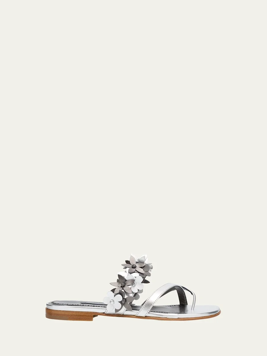 Manolo Blahnik "Fiosa" metallic leather thong sandals with floral appliques 0.25 in / 10 mm flat heel Open toe Easy slide style Leather outsole Lining: Goat leather Made in Italy Online Inquiries: BGS21_X6WMF| Store Inquiries: #5025816