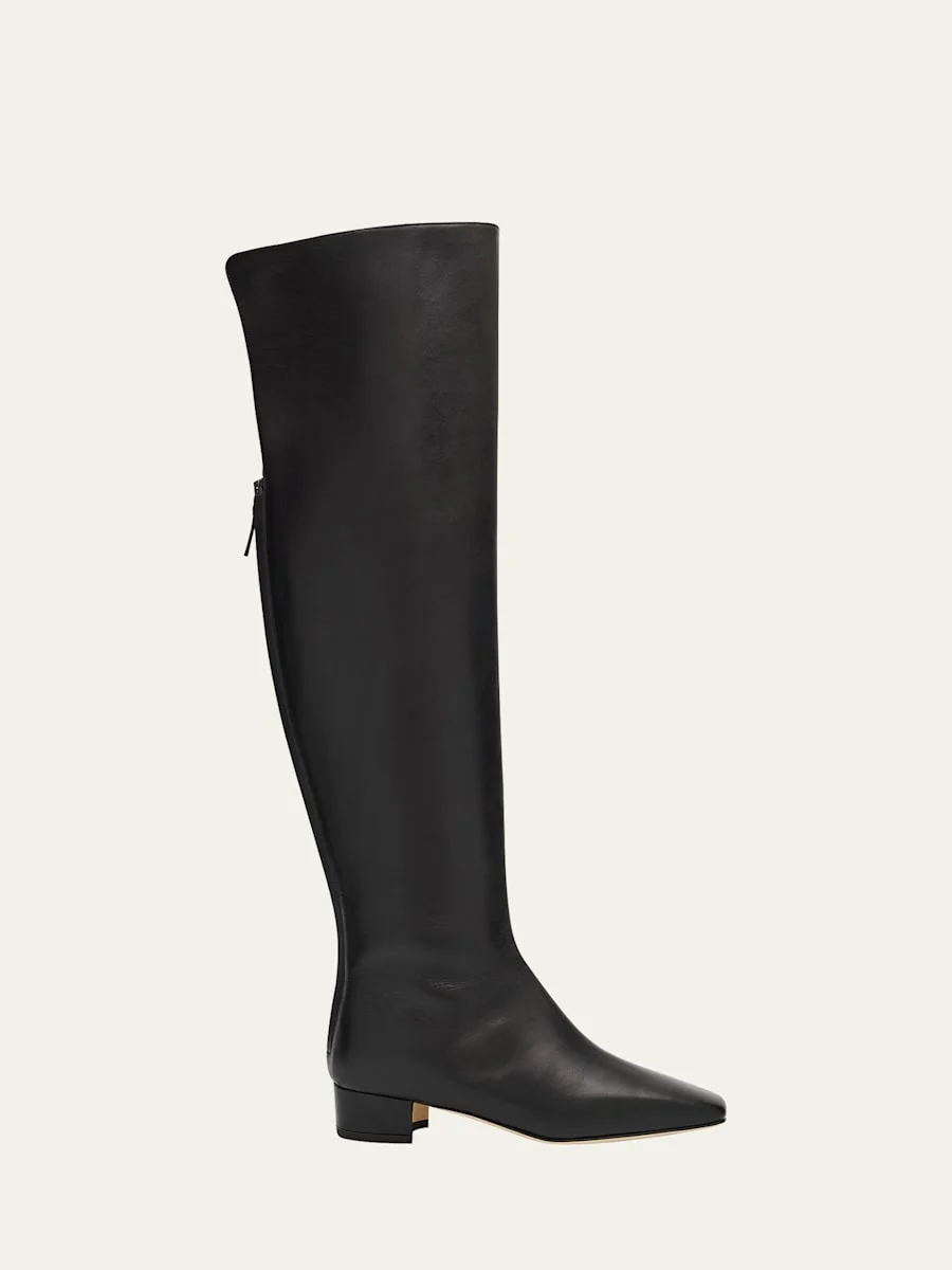Manolo Blahnik "Penelope" knee high boots in soft calf leather for sleek styling 1.25 in / 30 mm low block heel Square toe Back zip closure Goat leather lining Leather outsole Made in Italy Online Inquiries: BGS21_X6ZEK| Store Inquiries: #5070372