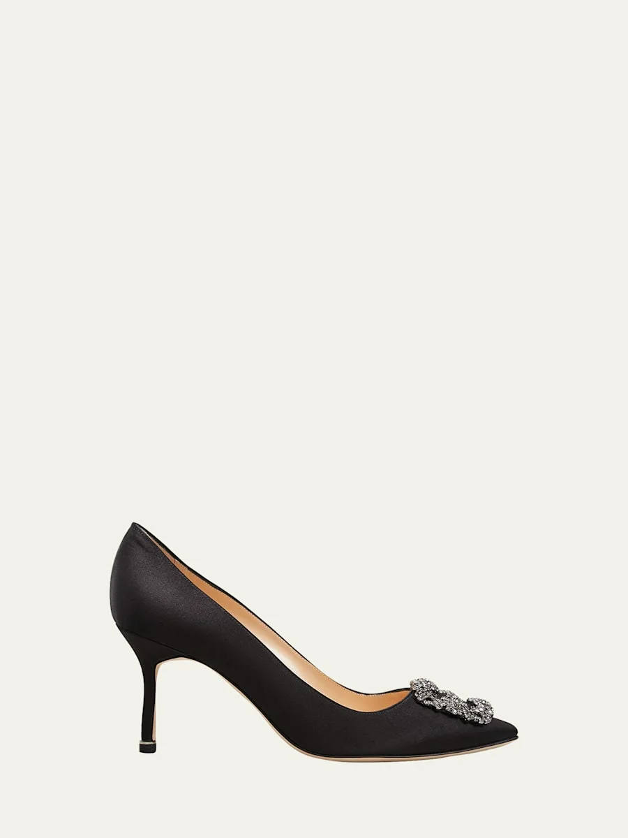 Manolo Blahnik satin pump. 3" covered heel. Pointed toe. Crystal buckle at vamp. Slipon style. Padded footbed. Smooth leather outsole. "Hangisi" is made in Italy.