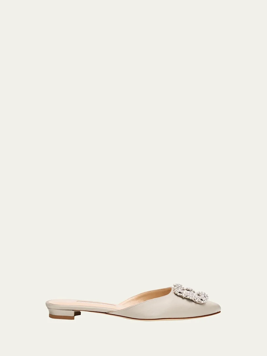 Manolo Blahnik "Hangisi" satin ballerina flats 0.25 in / 10 mm flat heel Pointed toe Crystal buckle at vamp Slip-on style Leather outsole Lining: Goat leather Made in Italy Online Inquiries: BGS21_X6WMP| Store Inquiries: #5025824