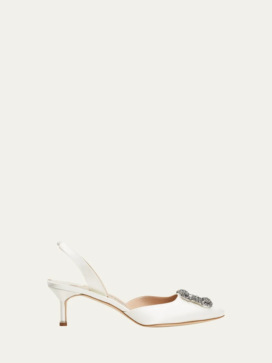 Manolo Blahnik "Hangisi" pumps in viscose and silk Features crystalembellished buckle accent 2" covered kitten heel Almond toe Stretch halter slingback Leather outsole Made in Italy