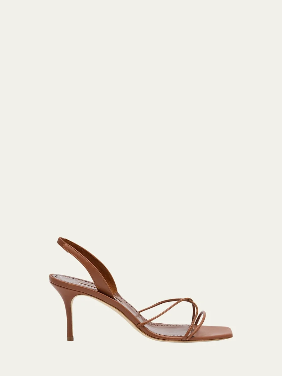 Manolo Blahnik strappy leather sandals 2.75 in / 70 mm stiletto heel Crisscross vamp Stretch slingback strap Leather lining and sole Made in Italy Online Inquiries: BGS21_X6M6Q| Store Inquiries: #4816461