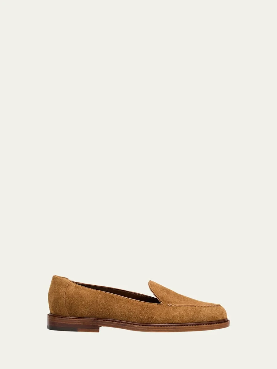 Manolo Blahnik "Maxy" loafers in suede 0.25 in / 10mm flat heel Round toe Notched vamp Slip-on style Leather outsole Goat leather lining Made in Italy Online Inquiries: BGS21_X6WMD| Store Inquiries: #5025814