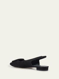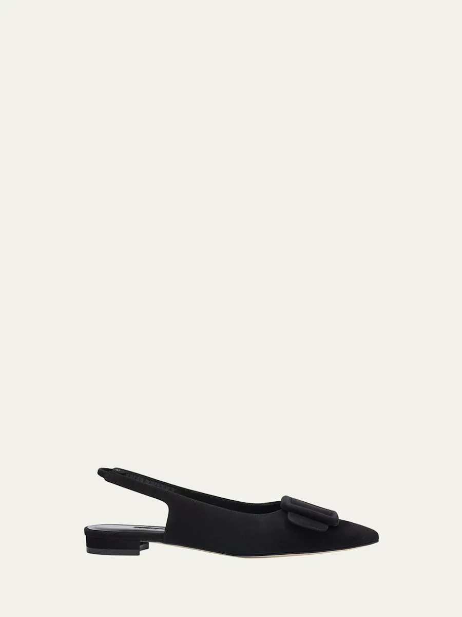 Manolo Blahnik "Maylura" kid suede slingback ballerina flats with signature covered buckle accent 0.25 in / 10 mm flat heel Pointed toe Stretch slingback strap Leather outsole Lining: Goat leather Made in Italy Online Inquiries: BGS21_X6WEY| Store Inquiries: #5022568