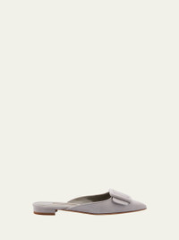 Manolo Blahnik "Maysale" suede ballerina mules with covered buckle detail. Flat heel. Pointed toe. Slide style. Leather lining and sole. Made in Italy. Size Note: Item runs large, consider ordering a size down. Online Inquiries: BGS21_X6UG5| Store Inquiries: #4816687
