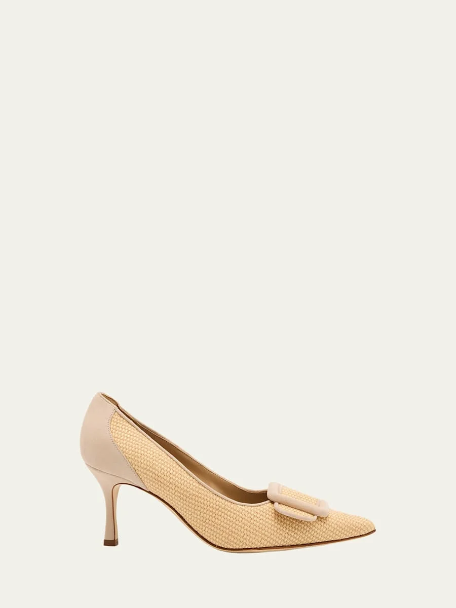 Manolo Blahnik "Maysale" woven nylon and cotton pumps with suede trim and a tonal buckle accent 2.75 in / 70 mm stiletto heel Pointed toe Slip-on style Leather outsole Lining: Goat leather Made in Italy Online Inquiries: BGS21_X6R42| Store Inquiries: #4902438