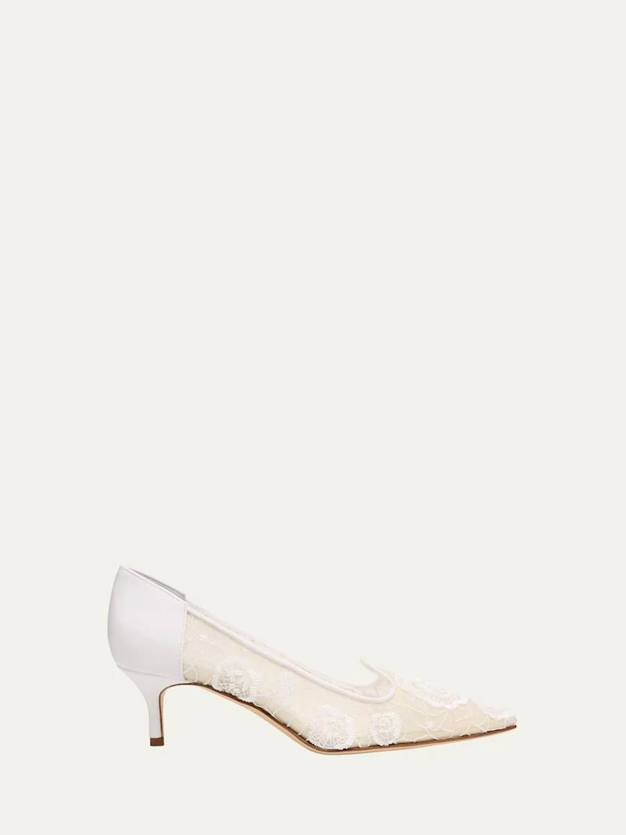 Manolo Blahnik "Milandrasli" floral-beaded lace pumps 2.00 in / 50 mm kitten heel Pointed toe Notched vamp Slip-on style Leather outsole Upper: Nylon/Polyamide Lining: Goat leather Made in Italy Online Inquiries: BGS21_X6WMH| Store Inquiries: #5025818