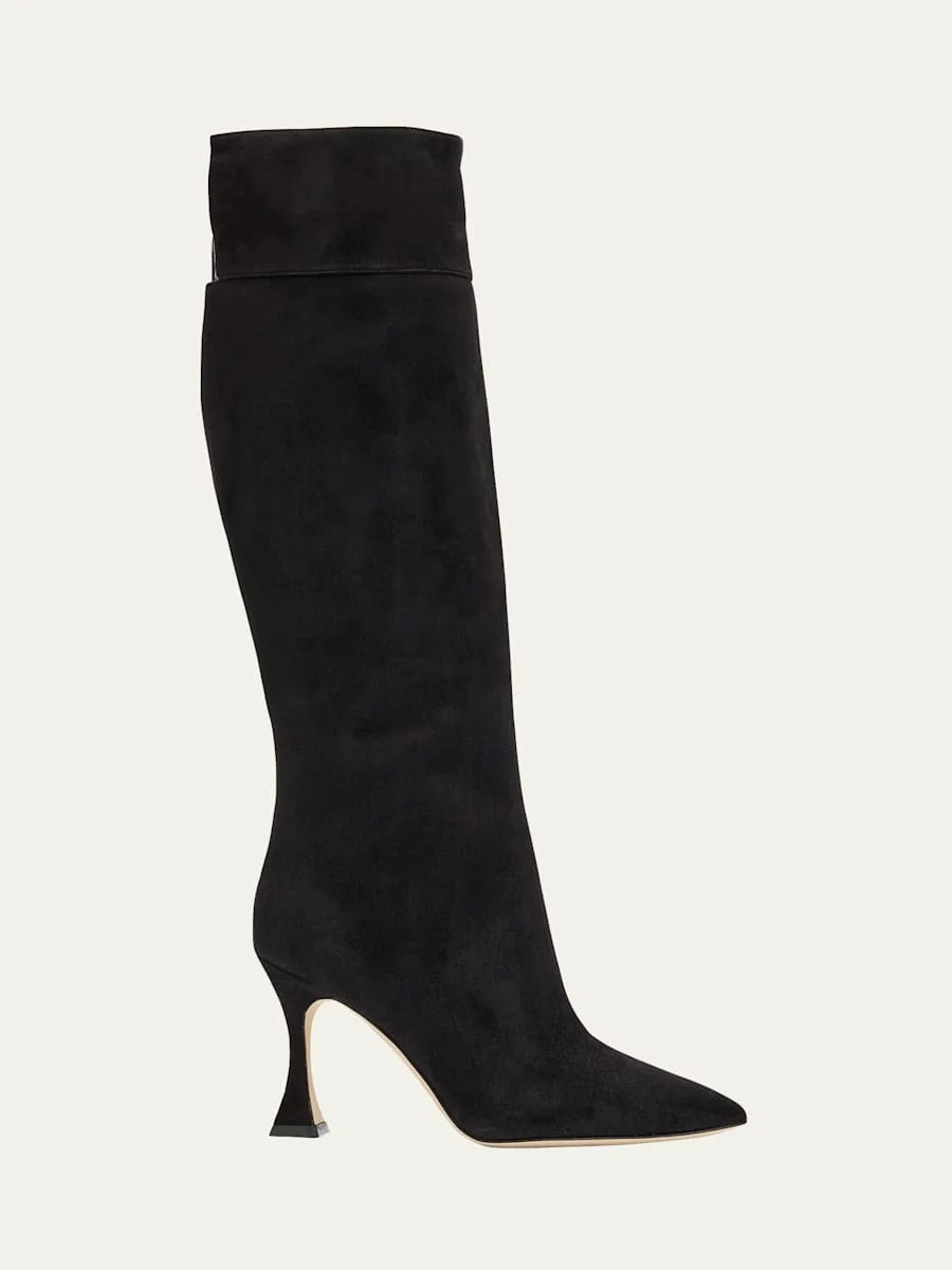 Manolo Blahnik "Miralonepla" knee boots in kid suede 3.50 in / 90 mm flared stiletto heel Pointed toe Pull-on style Leather outsole Goat leather lining Made in Italy Online Inquiries: BGS21_X6WM7| Store Inquiries: #5025808