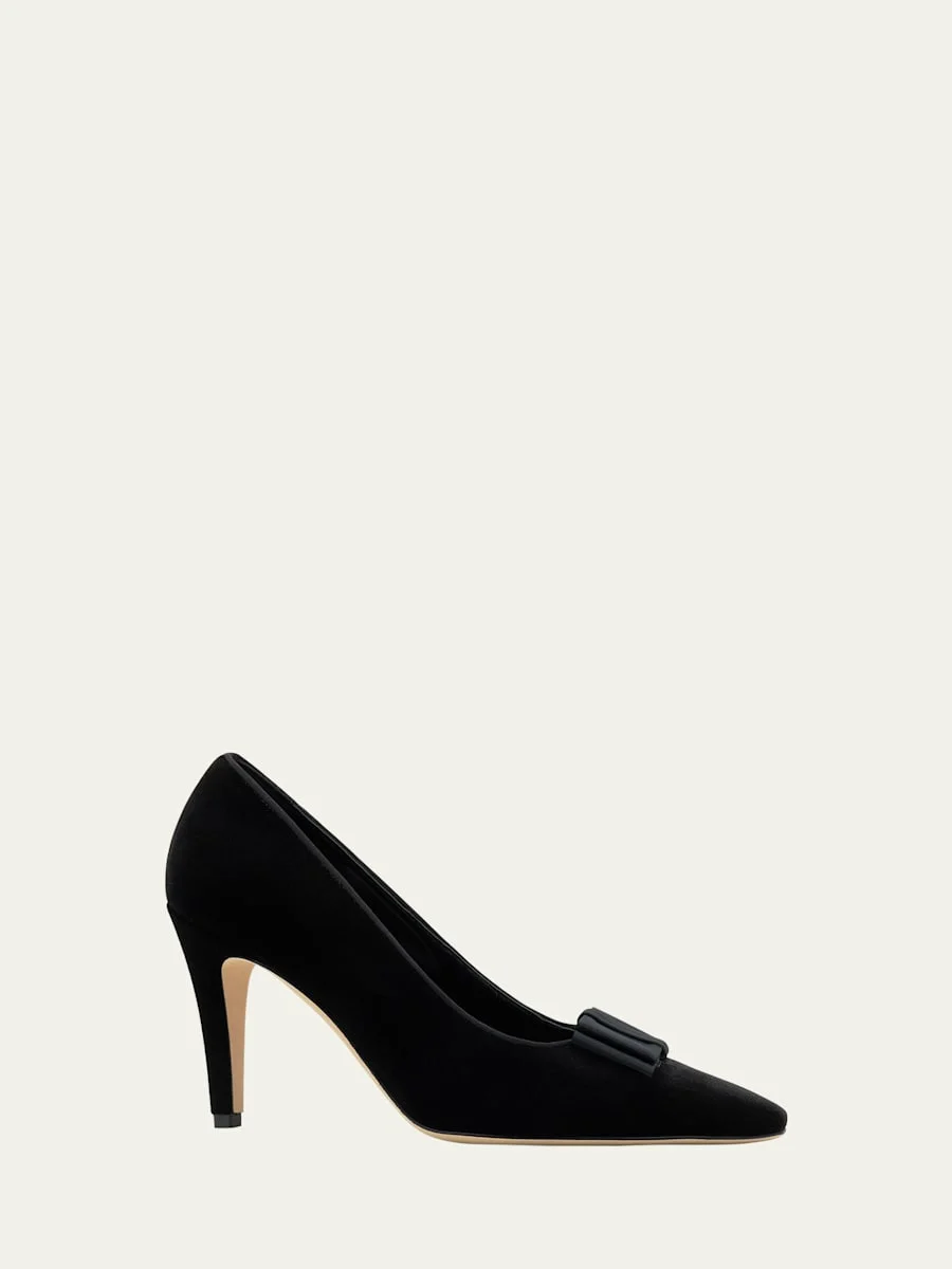 Manolo Blahnik "Readorhi" pumps in velvet with a grosgrain bow and trim 3.50 in / 90 mm stiletto heel Pointed toe Slip-on style Upper: polyester Goat leather lining Leather outsole Made in Italy Online Inquiries: BGS21_X6ZDU| Store Inquiries: #5070352