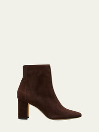 Manolo Blahnik "Rosie" ankle booties in kid suede 2.8" block heel Round toe Side zip eases dress Leather lining Leather outsole Item runs small, consider ordering a size up Made in Italy