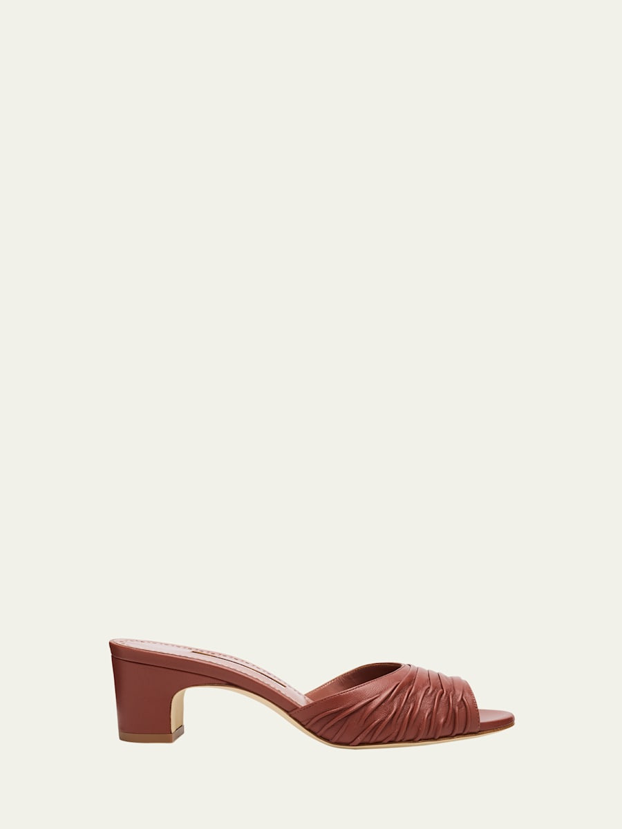 Manolo Blahnik ruched leather mule sandals 2.00 in / 50 mm block heel Open toe Slide style Leather outsole Lining: Goat leather Made in Italy