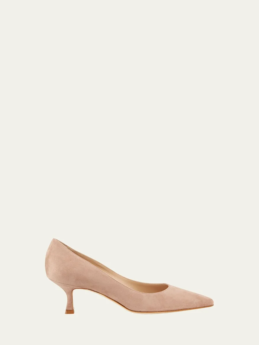 Manolo Blahnik suede pump. 2" covered heel. Pointed toe. Topstitched collar. Smooth outsole. Slip-on style. "Srila" is made in Italy. Online Inquiries: BGS21_X43KF| Store Inquiries: #2461012