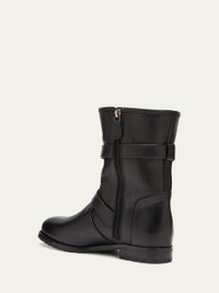 Manolo Blahnik "Sulaltra" calf leather biker booties Buckle straps at ankle and collar 0.25 in / 10 mm flat heel Round toe Side zip eases dress Leather outsole Lining: Leather Made in Italy