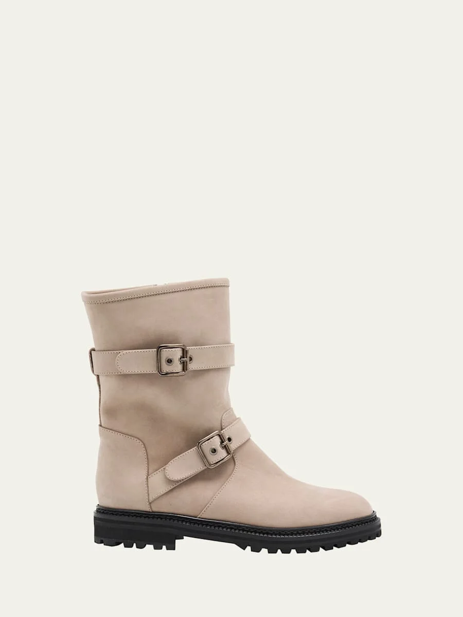 Manolo Blahnik "Sulaltrosa" lug-sole boots in nubuck leather with dual buckle straps 1.25 in / 30 mm flat heel Round toe Side zip eases dress Goat leather lining Leather outsole Made in Italy Online Inquiries: BGS21_X6ZEL| Store Inquiries: #5070373